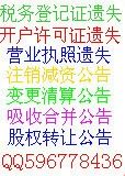 1》遗失声明:营业执照遗失,税务登记证遗失,组织机构代码证遗失,食品卫生许可证正副本遗失,公章遗失,财务章遗失,法人章遗失等